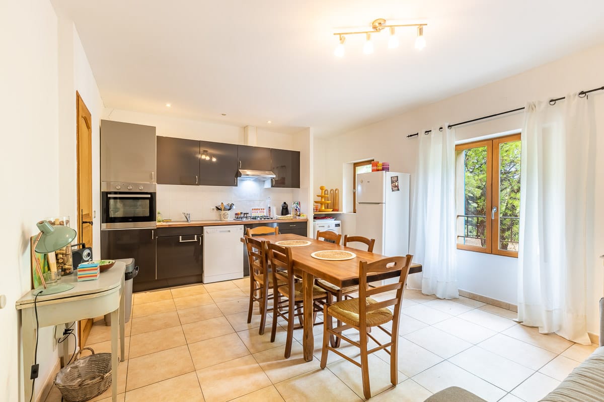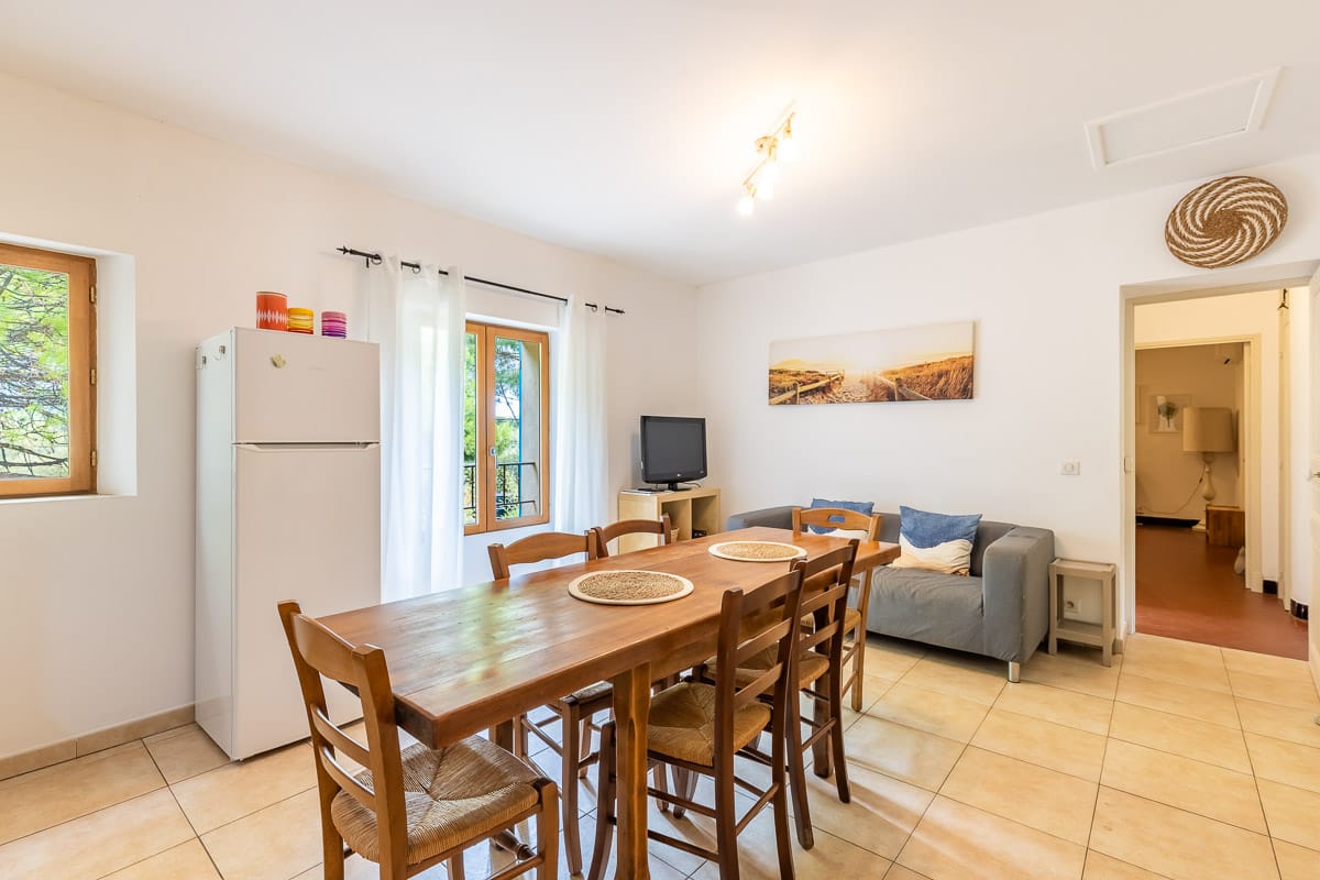 Le séjour, lumineux et convivial, comprend un coin repas et une cuisine ouverte entièrement équipée. Ainsi, vous pourrez préparer vos repas en toute simplicité, que ce soit pour un petit-déjeuner rapide ou un dîner plus élaboré.