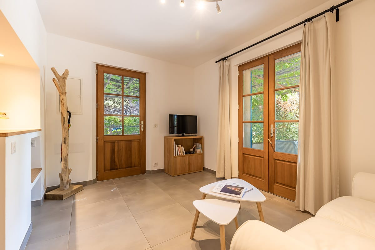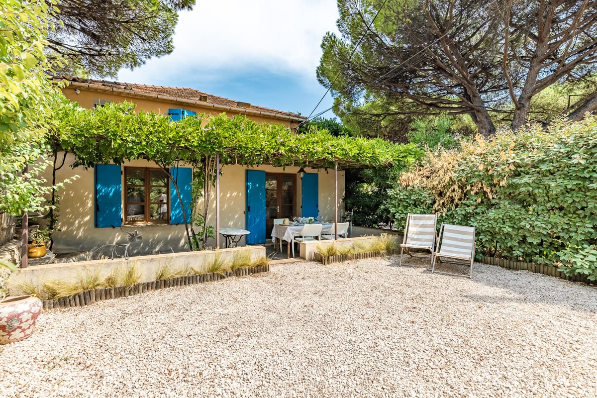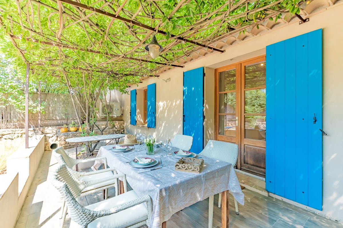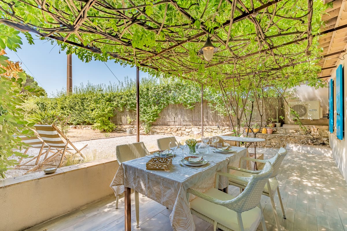 À l’extérieur, une terrasse privée ombragée par une pergola recouverte de glycine vous invite à savourer vos repas en plein air. En traversant quelques pas, vous accédez à un jardin privatif recouvert de graviers, aménagé avec deux bains de soleil pour des moments de détente. Ainsi, vous pourrez choisir entre l’ombre rafraîchissante de la pergola et le soleil provençal.