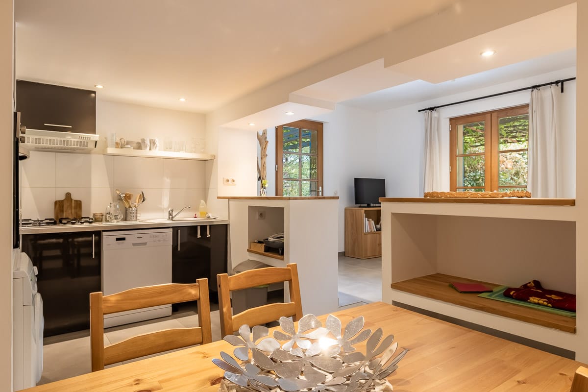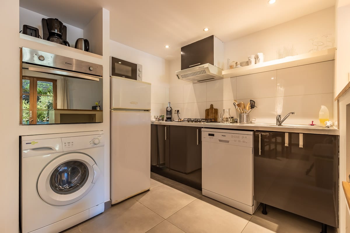 La pièce à vivre se compose d’un coin salon avec télévision et d’une cuisine ouverte entièrement équipée, ce qui permet de préparer facilement vos repas tout en profitant de la convivialité de l’espace. La salle de bain moderne, quant à elle, dispose d’une douche à l’italienne et d’un agencement fonctionnel.