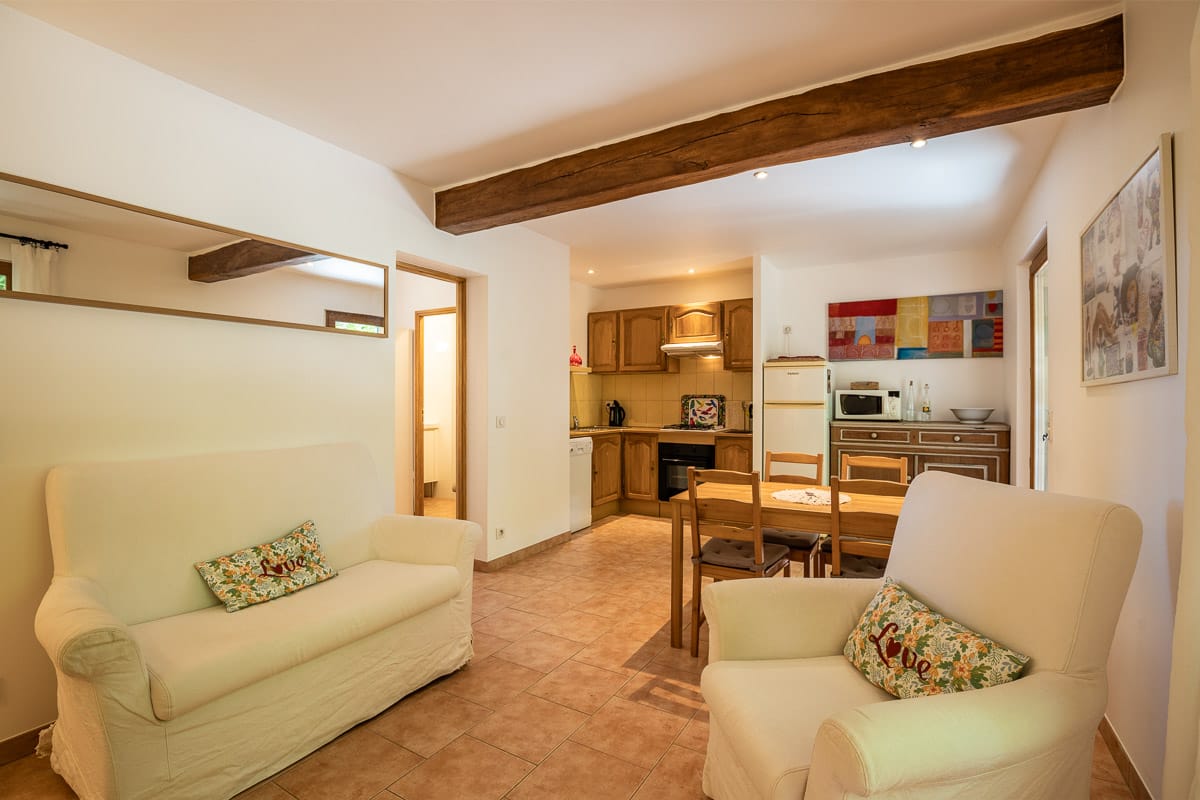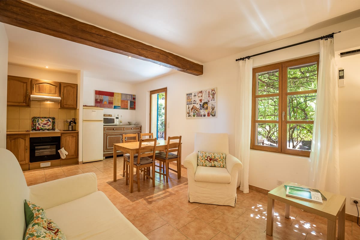 L’espace de vie climatisé comprend une cuisine ouverte entièrement équipée, un coin repas convivial et un salon chaleureux avec canapé et télévision.