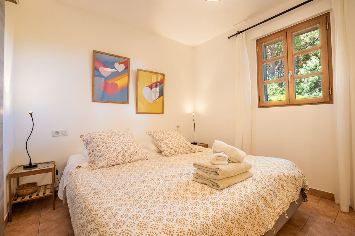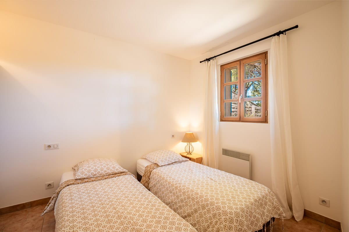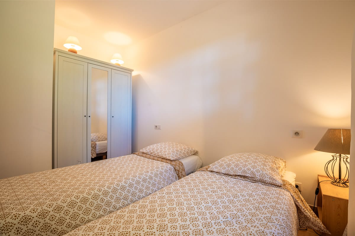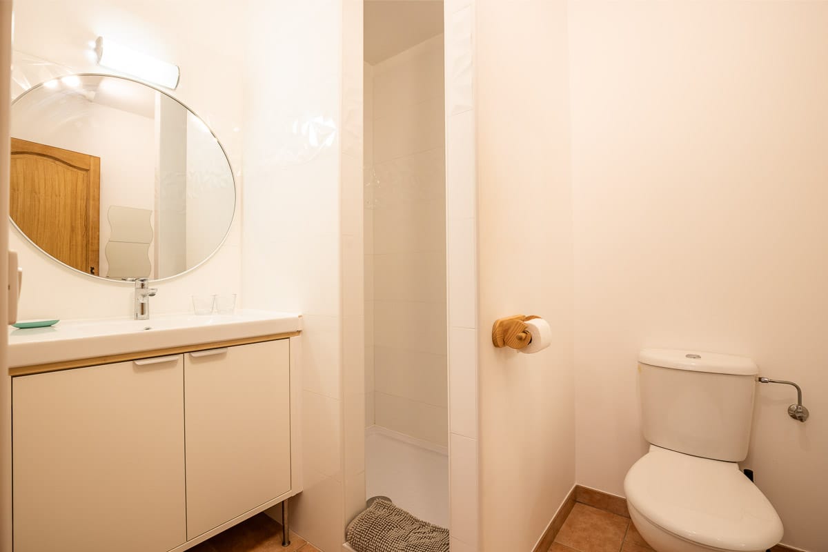 La chambre principale, équipée d’un lit double (180×200 cm), bénéficie d’une salle d’eau privative avec WC. La seconde chambre propose deux lits simples (90×200 cm) et sa propre salle de douche attenante, tandis qu’un second WC séparé est accessible à l’extérieur de la chambre.